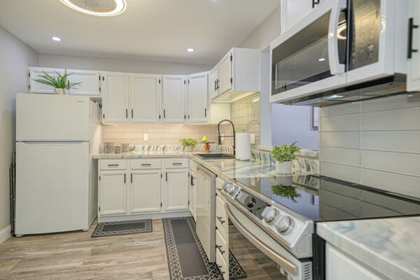 Impressive one of a kind condo in this very desirable complex. Move right into an easy access, first floor corner unit. So private & quiet it is the only unit on this wing. Recent updates throughout. Great kitchen with custom counters, copious cabinet space, smart lighting including recessed plus smart lights/fans. Spacious living rm with huge sliders & lots of natural light. Enjoy beautiful sunsets from your own outdoor patio. Spacious main bedroom has a wonderful walk-in closet & fantastic new tiled bath with quartz vanity, shower & linen closet. The second full bath is also updated with tile flooring & quartz vanity. You will love the convenience of garage parking (space 22), public transportation just outside the building & near bustling downtown. This impeccable complex has many updates such as new elevators! Tasteful updates coupled with a wonderful layout, all while living at Melrose’s downtown dining/activities & shopping walk to bus/|train and Fell.