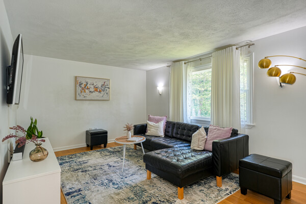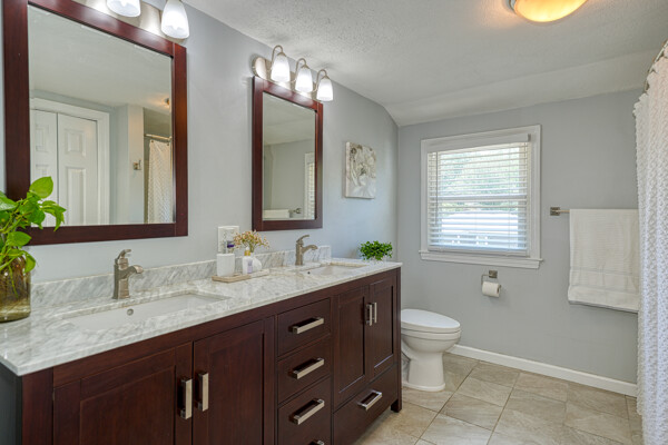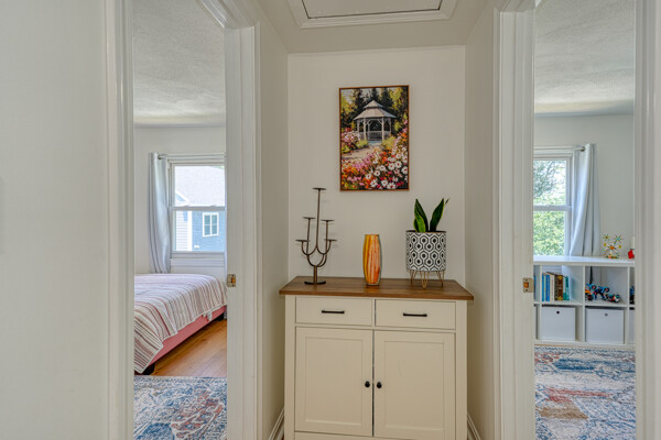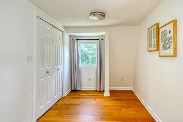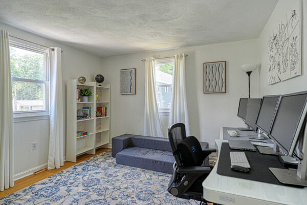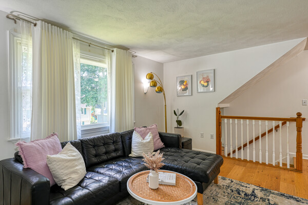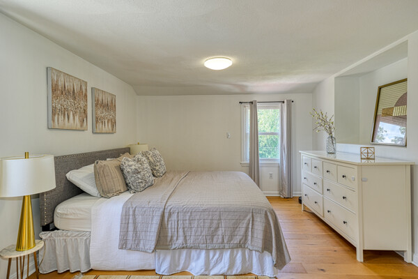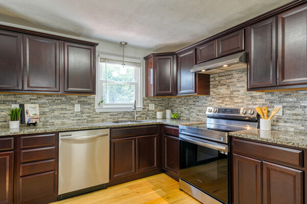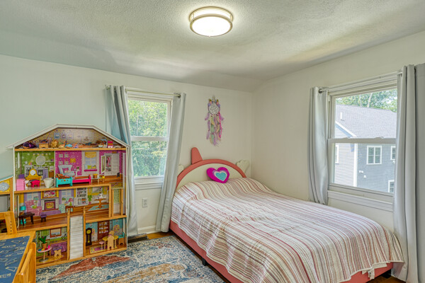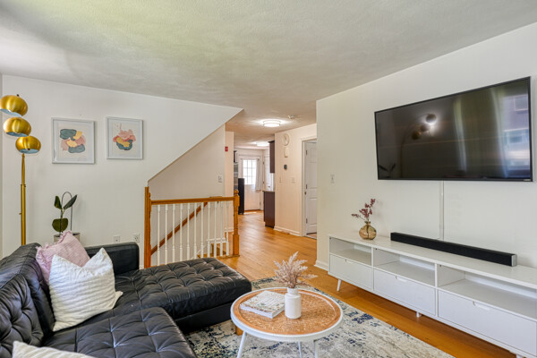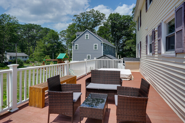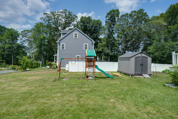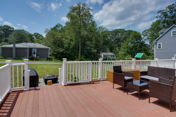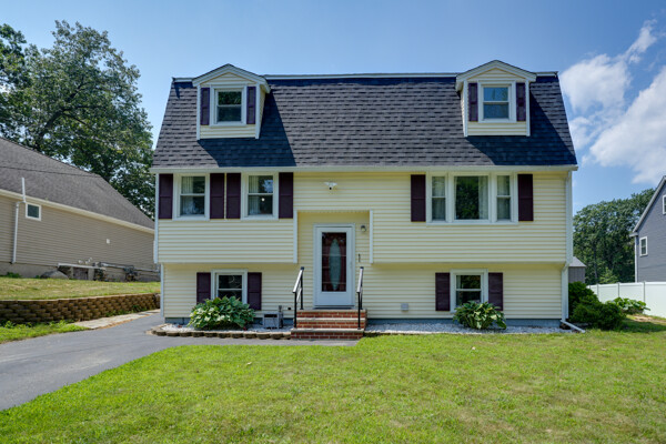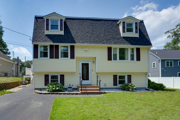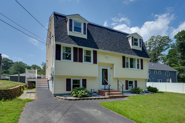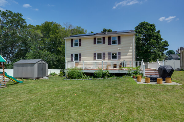 Young and updated Gambrel with tasteful improvements offering frontage on 2 dead-end streets featuring 5 bedrooms, 3 baths. The first level offers a fully applianced kitchen w/pantry closet, newer cabinets/granite counters, Samsung stainless steel appliances and tile backsplash, dining room, living room, 1st floor bedroom and full bath. The second level offers 3 bedrooms including a primary w/great closet space, and full bath w/tile surround tub/shower combo, w/granite, and double vanities. The lower level offers a family room currently used a play/bedroom, complete with full bath, closet plus a walkout. relax on the large composite deck overlooking the huge level lot or in the sunken hot tub! Updates include all new roof, updated bathroom, new engineered hardwood flooring throughout (excluding family rm) energy efficient solar, new lighting, new shed, convenient & efficient natural gas, central air, MA Save insulation, Excellent location close to major routes, shopping, restaurants.