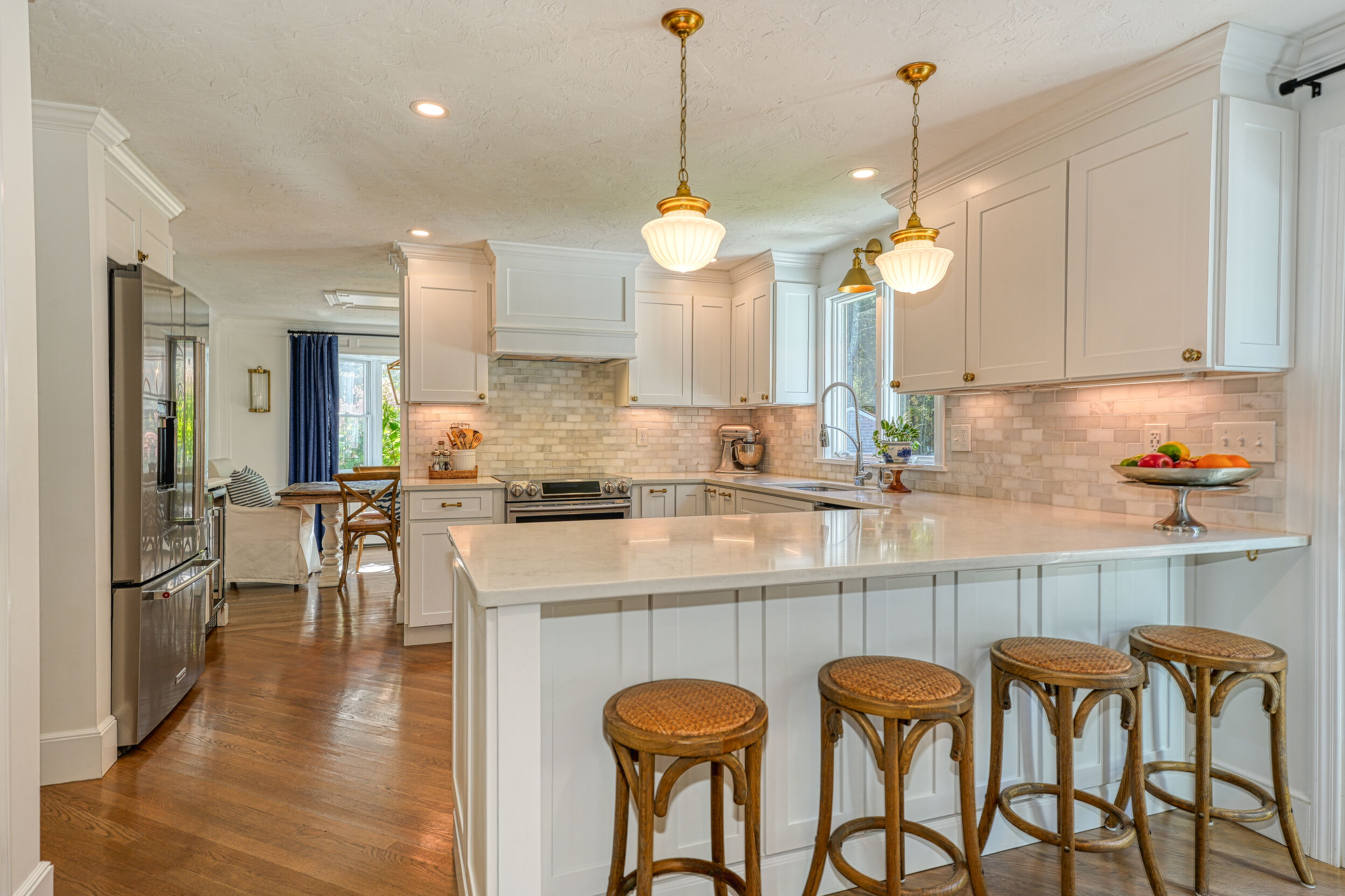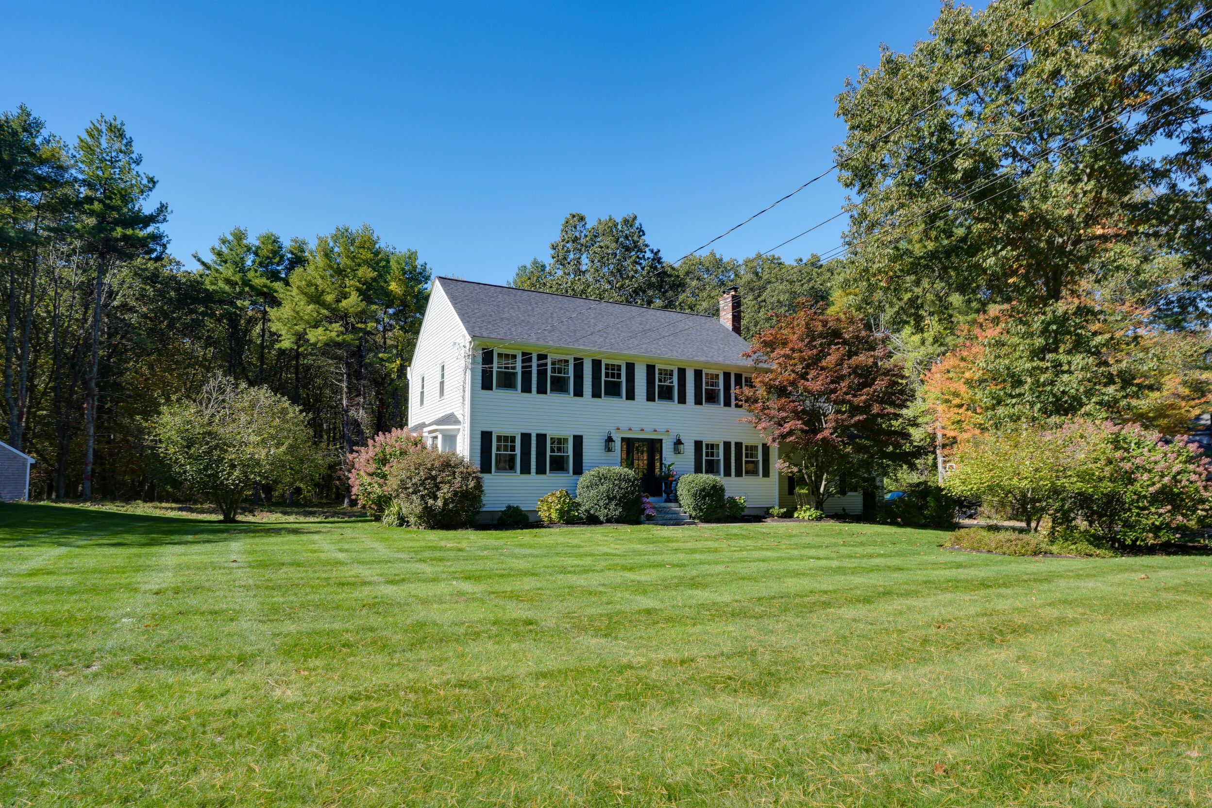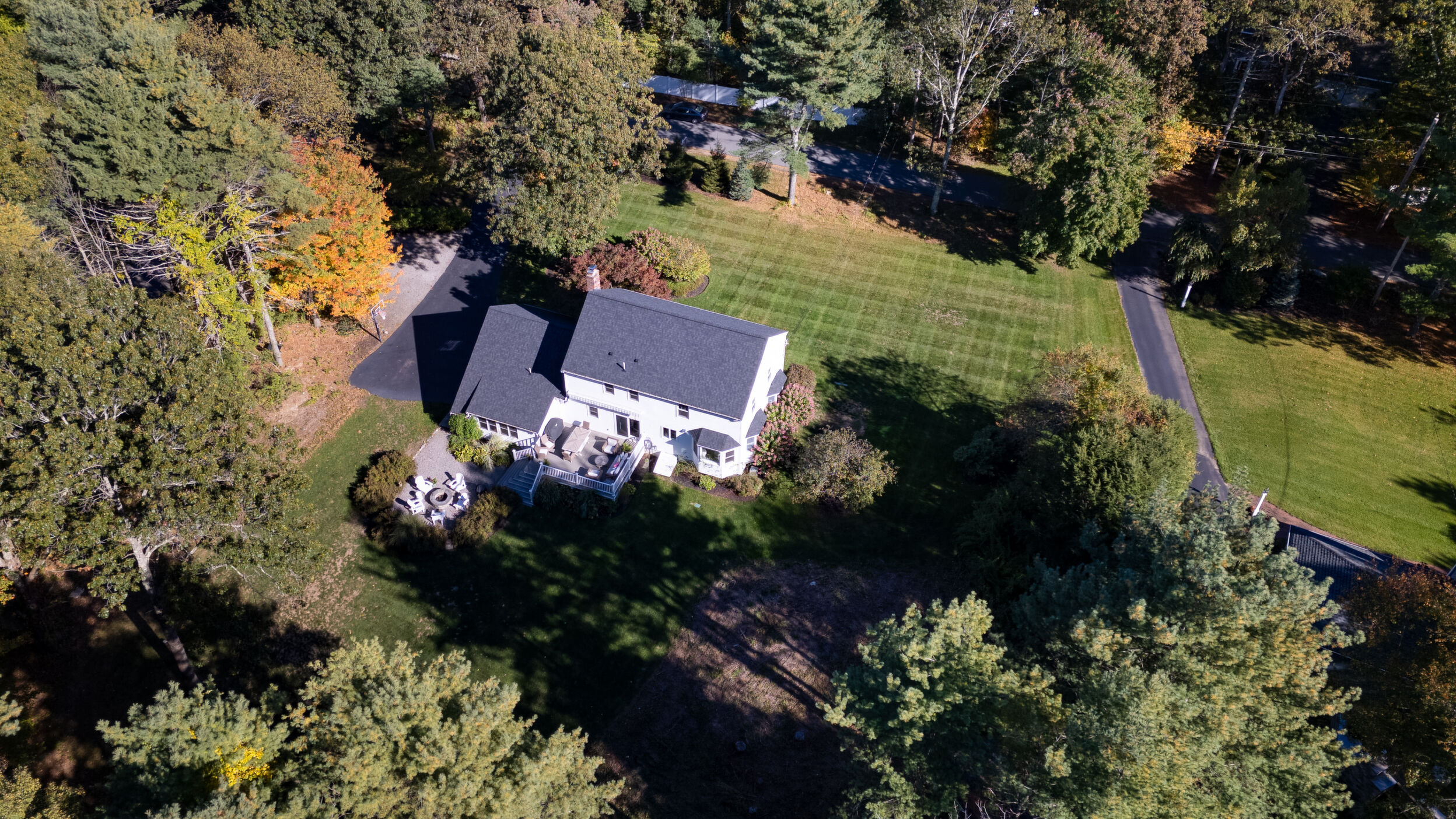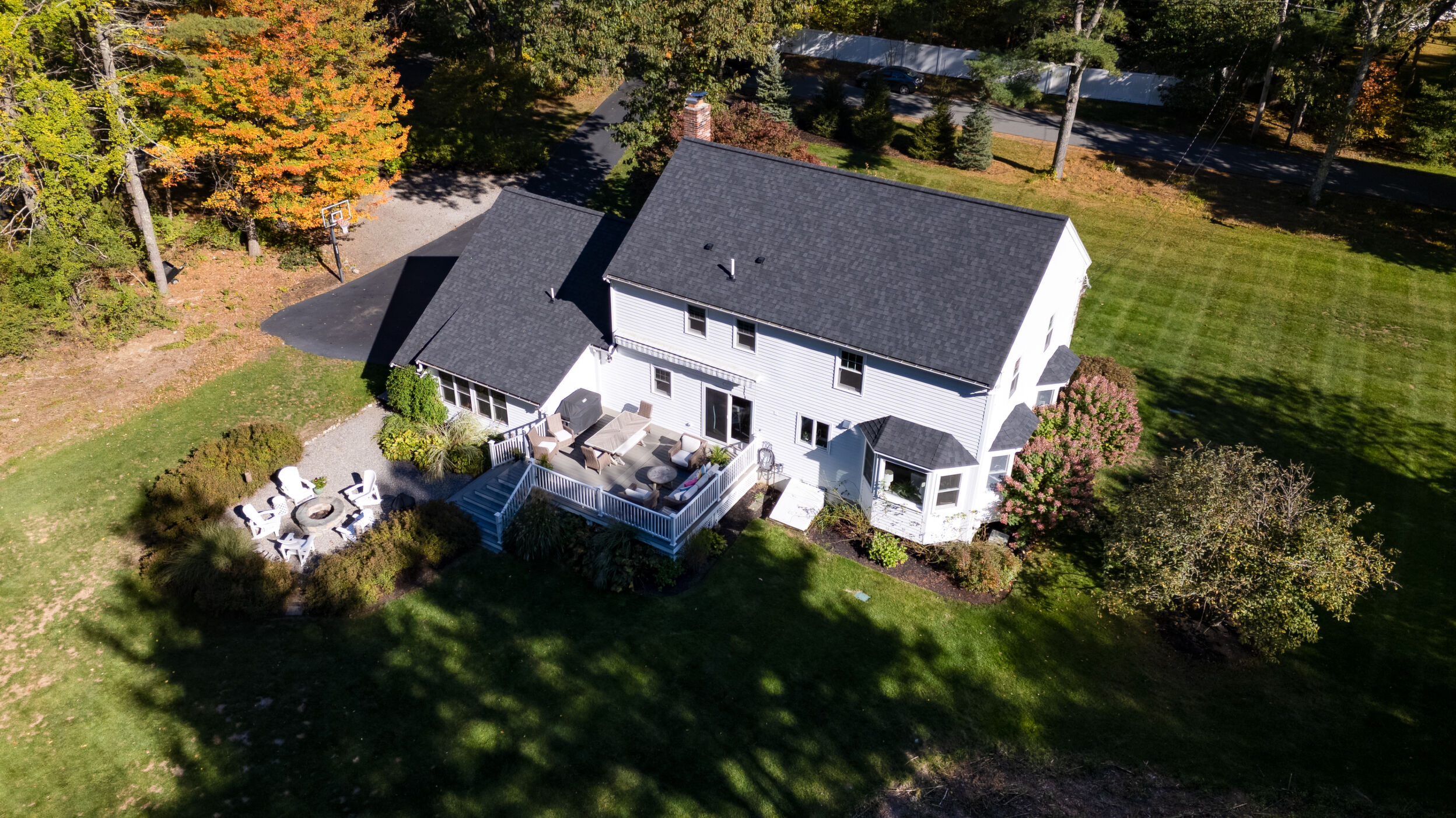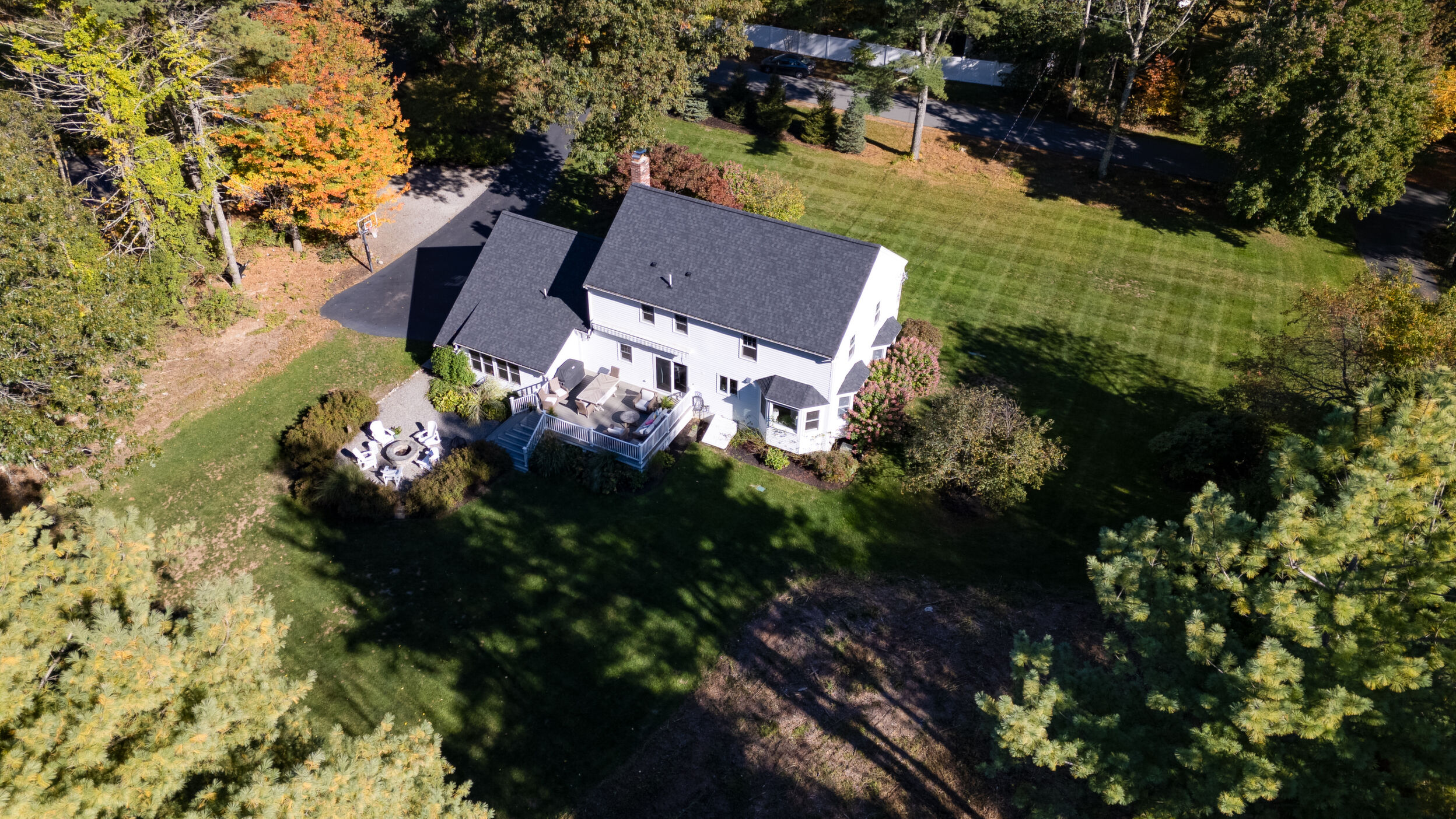 Beautifully updated and meticulously maintained Colonial offering a spacious and functional layout. The remodeled kitchen features sleek quartz countertops, ample cabinetry, and newer stainless steel appliances. Enjoy a sun-filled family room with a cozy fireplace, a gracious living room with custom built-in shelving, and an elegant formal dining room with detailed trim work. Step outside to a generous deck with retractable awning overlooking a serene, landscaped backyard with a built-in fire pit—ideal for outdoor entertaining. The second level boasts a large primary suite with a fully renovated bathroom featuring marble tile, plus three additional well-sized bedrooms and a stylish updated full bath. The finished lower level offers a versatile bonus room with high ceilings, perfect for a home office, gym, or recreation space. Notable updates include windows (2024/2012), roof and gutters (2021), and furnace and hot water tank (2020). Truly move-in ready!