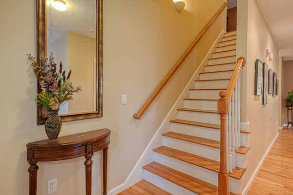 Welcome to this lovely end unit in the desirable Westridge Community. Sited on a prime perimeter lot, enjoy the private paver patio that overlooks a wooded area. The open floor plan seamlessly transitions between the living and dining areas. Hardwood floors grace the living/dining area, kitchen, and stairs. A well-appointed kitchen with stainless appliances and featuring sleek granite countertops. The charming breakfast nook, with a sliding door, invites you to savor your morning coffee. First floor primary bedroom with walk-in closet and beautiful bath with double vanity, granite counters, custom tile shower and bidet. The second floor includes a spacious loft, offering the perfect setting for a den, home office or a quiet reading nook. An additional generous-sized bedroom, full bath, provide ample space for family and guests. The finished room in the basement can be used as an art studio or exercise room. Within easy reach of routes 495 and 290. Minutes to vibrant downtown Hudson.